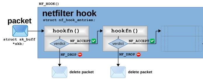 这种链式调用回调函数的工作方式,也让 netfilter hook 被称为链,如果 nf_hook_ops 的回调函数返回 NF_ACCEPT,则nf_iterate 将会继续调用下一个 nf_hook_ops 的回调函数,如果返回 NF_DROP,则中断遍历