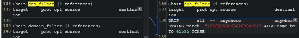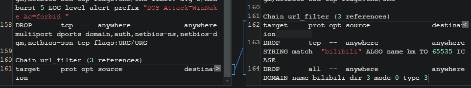 使用STRING匹配包含指定字符串的域名,在INPUT链上丢弃包含指定字符串的DNS请求,以及定义FORWARD链规则,丢弃包含指定字符串的数据包