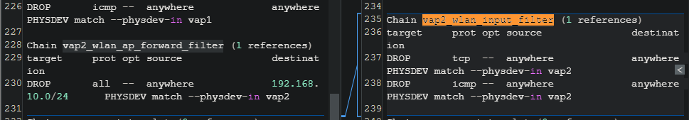 在链路vap2_wlan_input_filter中定义规则,阻止所有通过vap2接口进入的TCP和ICMP流量