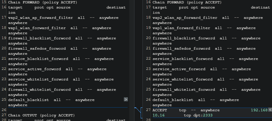 定义FORWARD链路-j跳到自定义链路service_blacklist_forword链路上再跳转到HI_LANHOST_MACFILTER_FORWARD链路上,丢弃目标地址为设定MAC的数据包