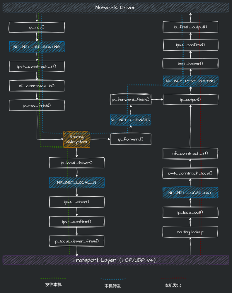 NF_INET_PRE_ROUTING: 这个 hook 在 IPv4 协议栈的ip_rcv()函数或 IPv6 协议栈的ipv6_rcv()函数中执行。是所有接收数据包到达的第一个 hook 触发点NF_INET_LOCAL_IN: 这个 hook 在 IPv4 协议栈的ip_local_deliver()函数或 IPv6 协议栈的ip6_input()函数中执行。经过路由判断后,所有目标地址是本机的接收数据包到达此 hook 触发点NF_INET_FORWARD: 这个 hook 在 IPv4 协议栈的ip_forward()函数或 IPv6 协议栈的ip6_forward()函数中执行。经过路由判断后,所有目标地址不是本机的接收数据包到达此 hook 触发点NF_INET_LOCAL_OUT: 这个 hook 在 IPv4 协议栈的__ip_local_out()函数或 IPv6 协议栈的__ip6_local_out()函数中执行。所有本机产生的准备发出的数据包,在进入网络栈后首先到达此 hook 触发点NF_INET_POST_ROUTING: 这个 hook 在 IPv4 协议栈的ip_output()函数或 IPv6 协议栈的ip6_finish_output2()函数中执行。本机产生的准备发出的数据包或者转发的数据包,在经过路由判断之后, 将到达此 hook 触发点