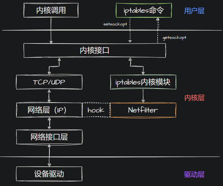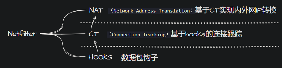 Netfilter 是 Linux 内核中的框架,用于处理数据包的过滤、修改、转发和网络地址转换(NAT),支持防火墙、NAT 和连接跟踪等网络功能